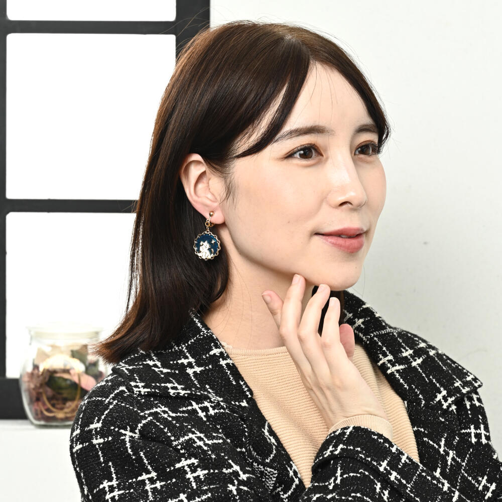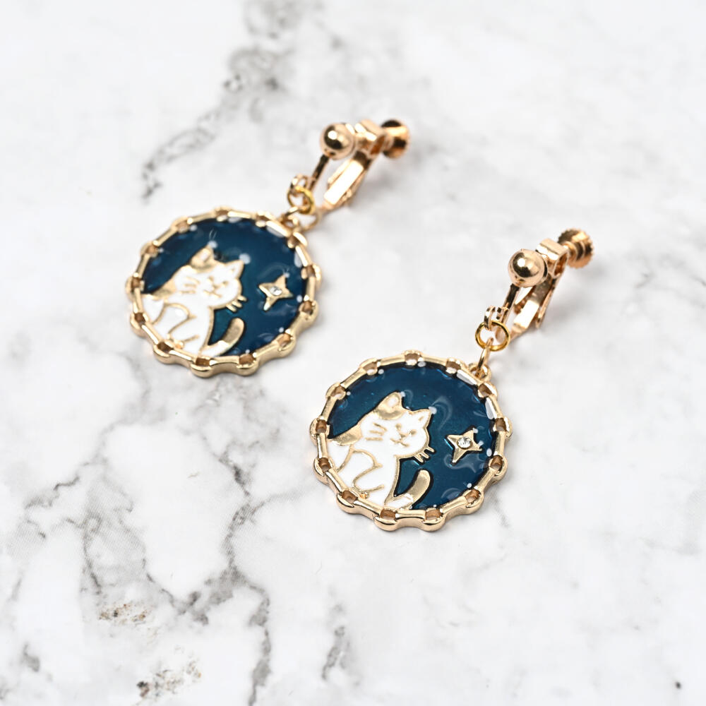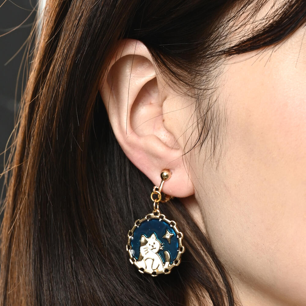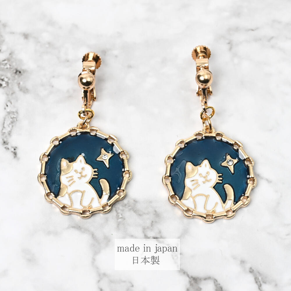 日本製 イヤリング レディース 猫 ネコ ねこ ラインストーン 星空 揺れる 可愛い E