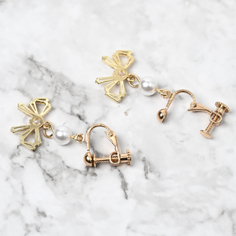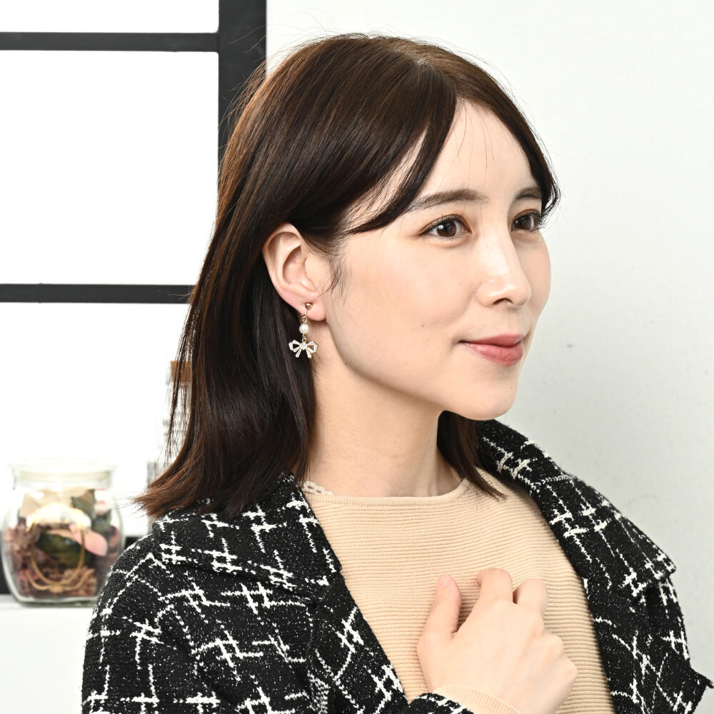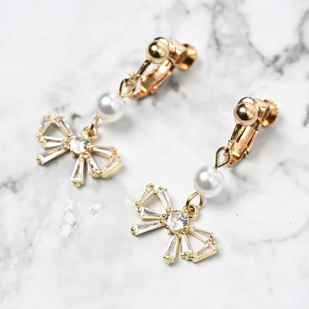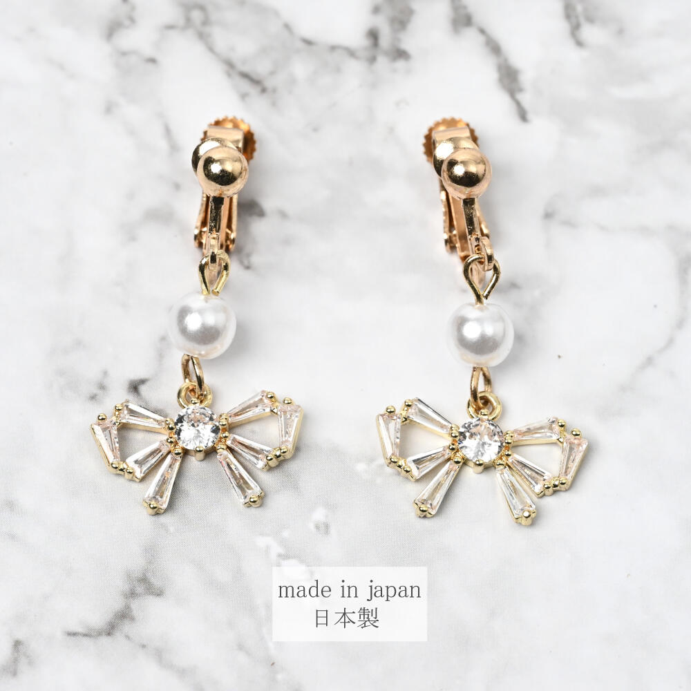 日本製 イヤリング レディース キュービックジルコニア パール リボン 可愛い E