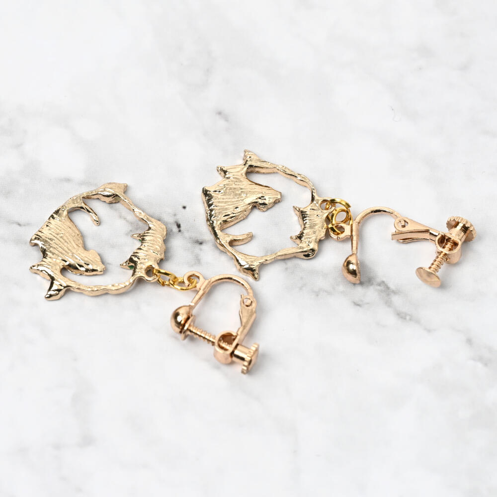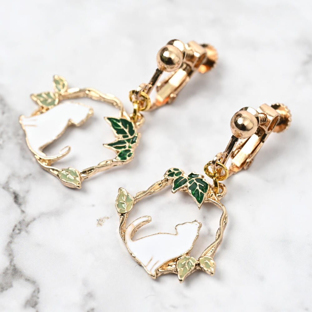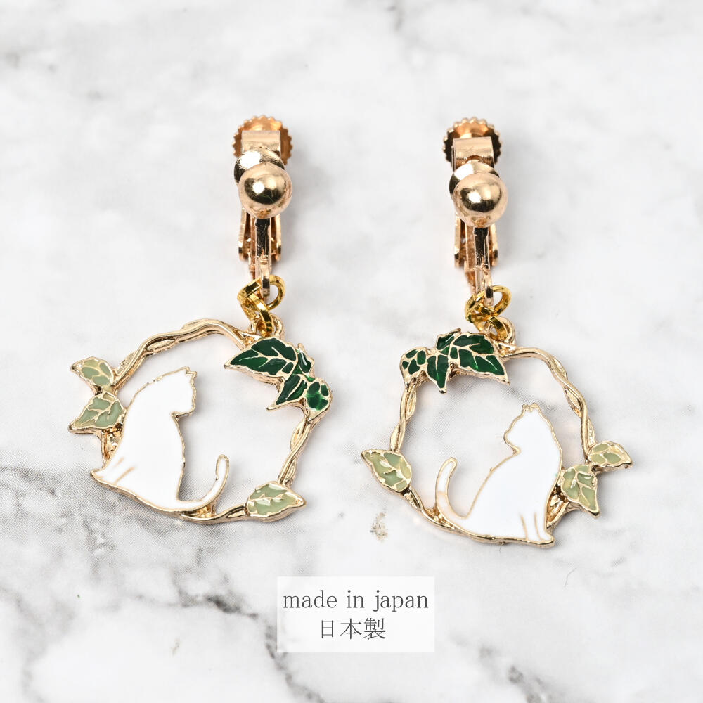 日本製 イヤリング レディース 猫 ネコ ねこ 揺れる シルエット リーフ 可愛い E